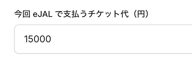 「今回 eJAL で支払うチケット代(円)」に、実際に支払うポイント数(eJALポイントでの支払額に相当する円換算)を入力します。例として、15,000円相当のeJALを使う場合には 15,000 と入力します。