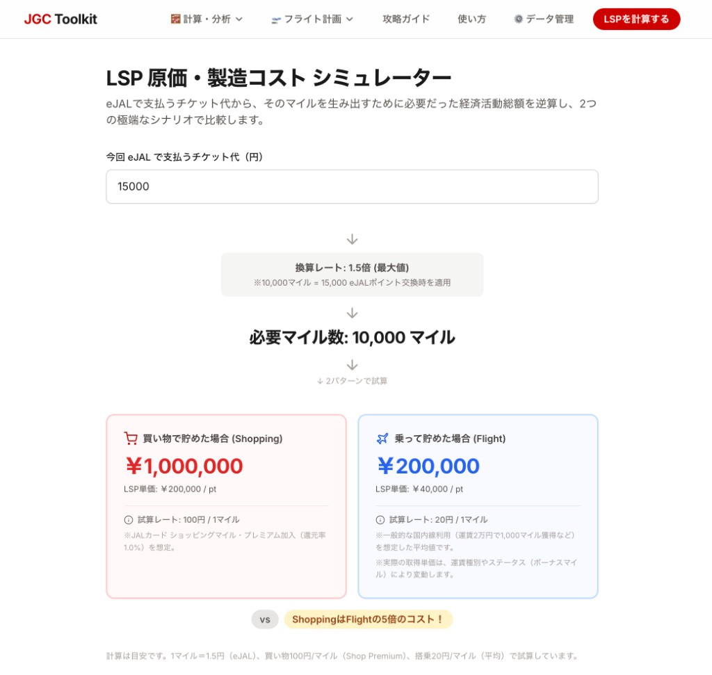 LSP原価シミュレーターは、eJALで支払うチケット代をもとに、そのマイルを生み出すために必要だった経済活動の総額を逆算するツールです。「カード決済だけで達成した場合」と「フライトだけで達成した場合」の2パターンを比較し、LSP獲得の実質単価を把握できます。