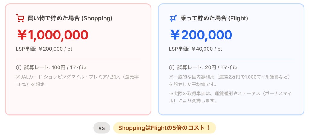 そのマイル数を、「カード決済のみ」と「フライトのみ」の2パターンで達成した場合の総額と、LSP1ptあたりの単価が表示されます。