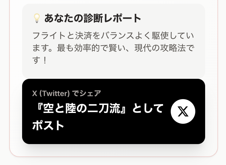 診断称号:入力内容から「爆速のJGC修行僧」「真正の空マイラー」「陸(おか)の石油王」など、7種類の称号のいずれかが自動で割り当てられます。獲得スタイル(フライト中心か決済中心か、達成までの年数など)に応じて決まります。