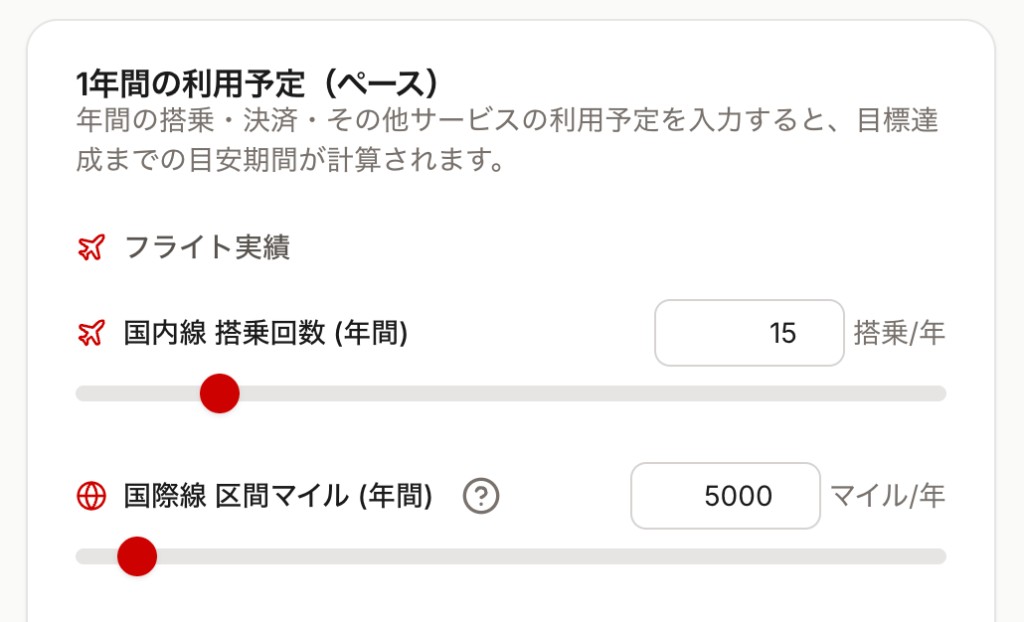 - 国際線マイル:年間に獲得する国際線の区間マイル合計