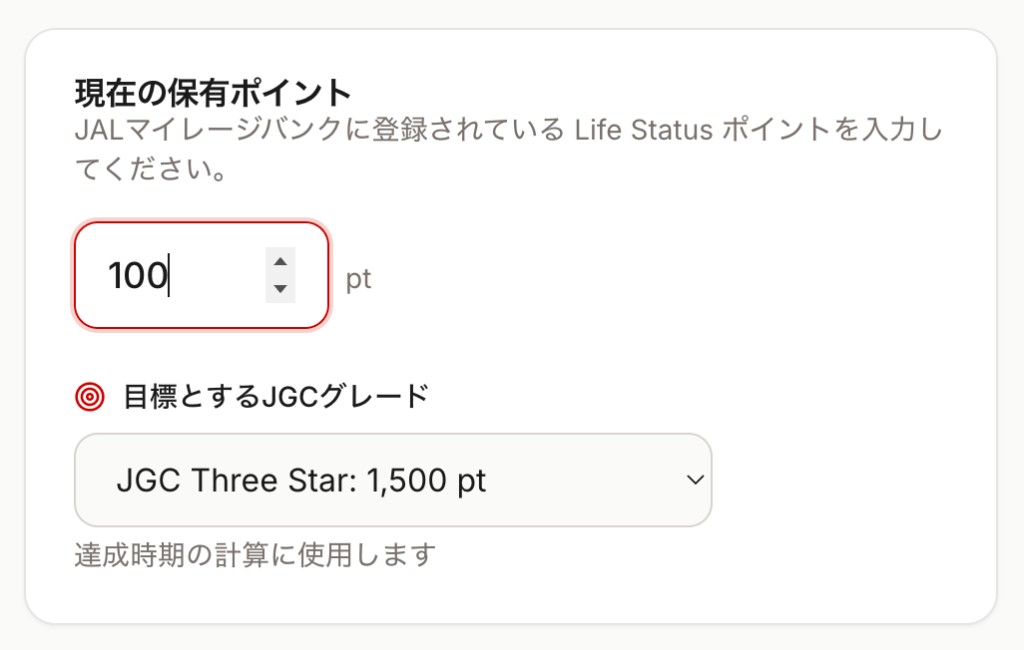 画面上部の「現在の Life Status ポイント」欄に、JALマイレージバンクのマイページで確認できる現在のポイント数を入力します。