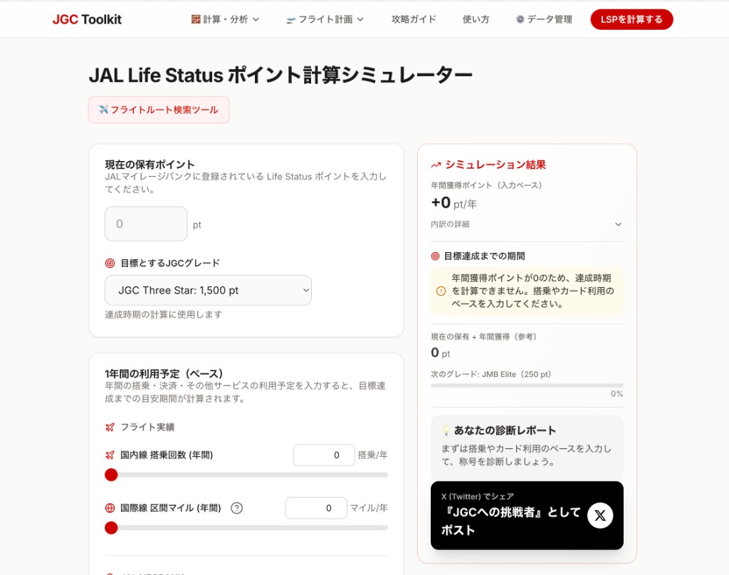 JAL LSP計算機は、あなたの搭乗実績や決済額を入力すると、Life Statusポイントの獲得シミュレーションとJGC到達までの進捗を表示するツールです。目標グレードまでの必要ポイントや、到達までの年数がリアルタイムでわかります。