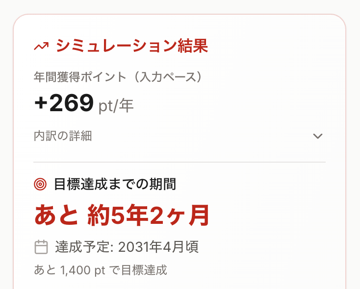 右側の結果パネルで、目標までの必要ポイントや到達までに必要な年数、ランクアップに必要な搭乗回数などが確認できます。入力値を変えると、即座に結果が更新されます。