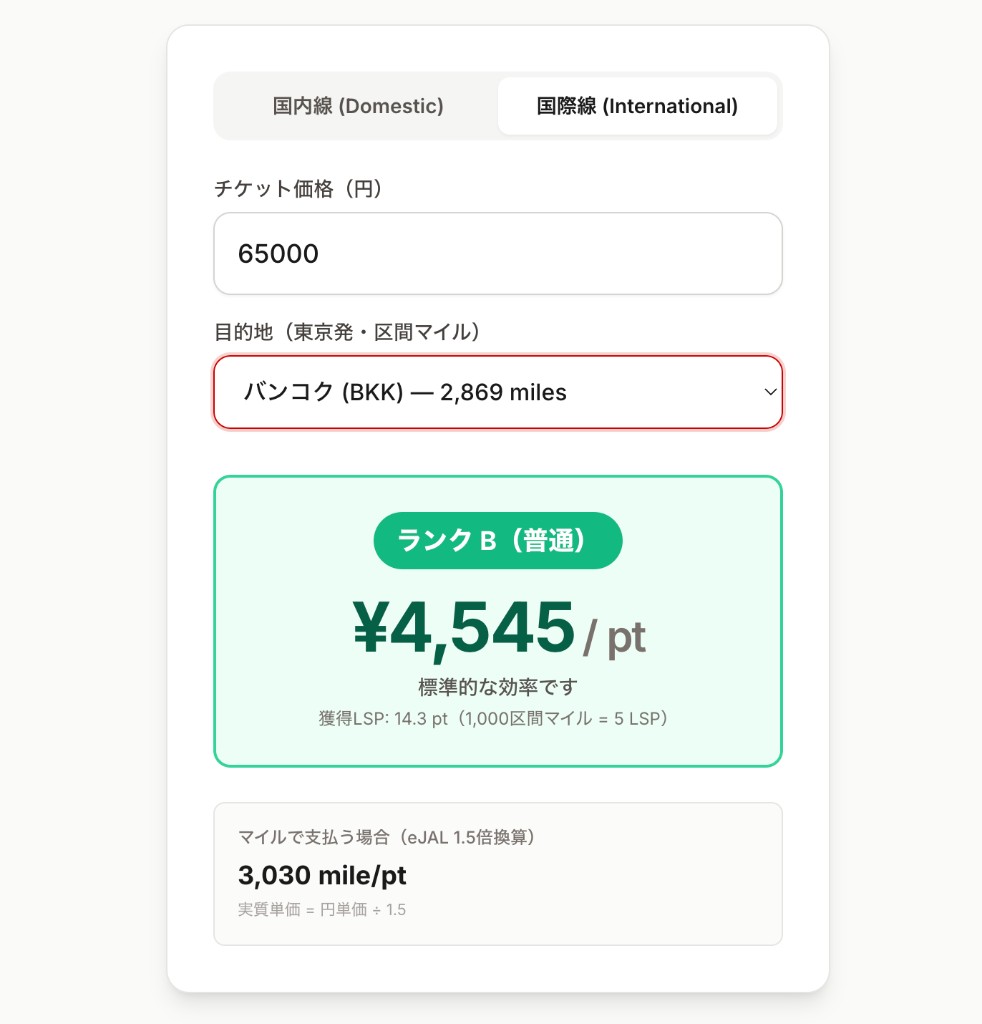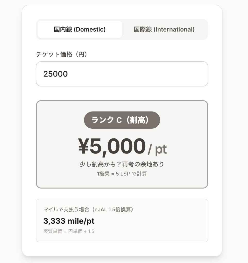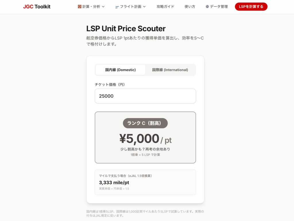 国内線は「1搭乗=5pt」で固定のため、価格を入力するだけでLSP単価が算出されます。結果が S〜C のいずれかで表示されます。